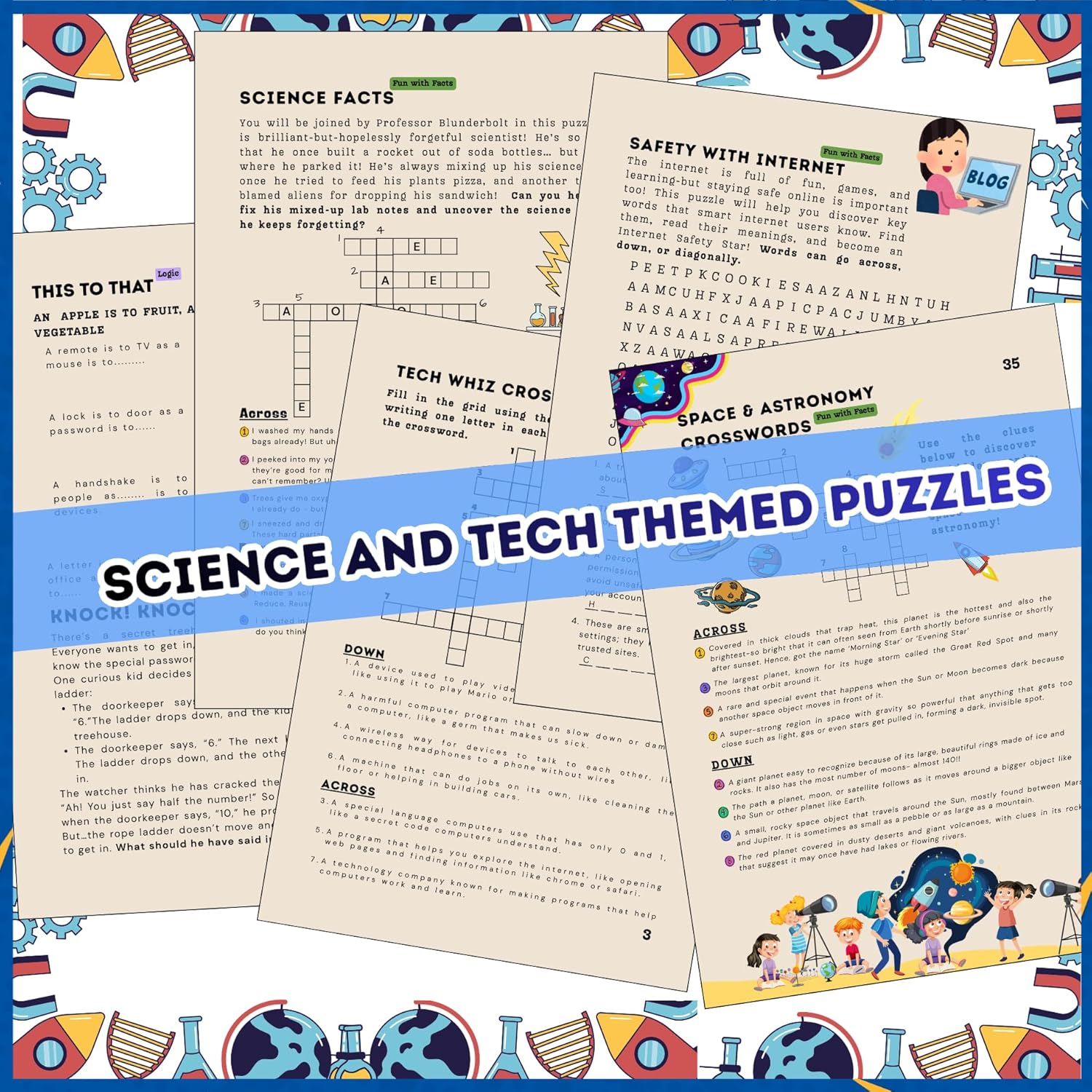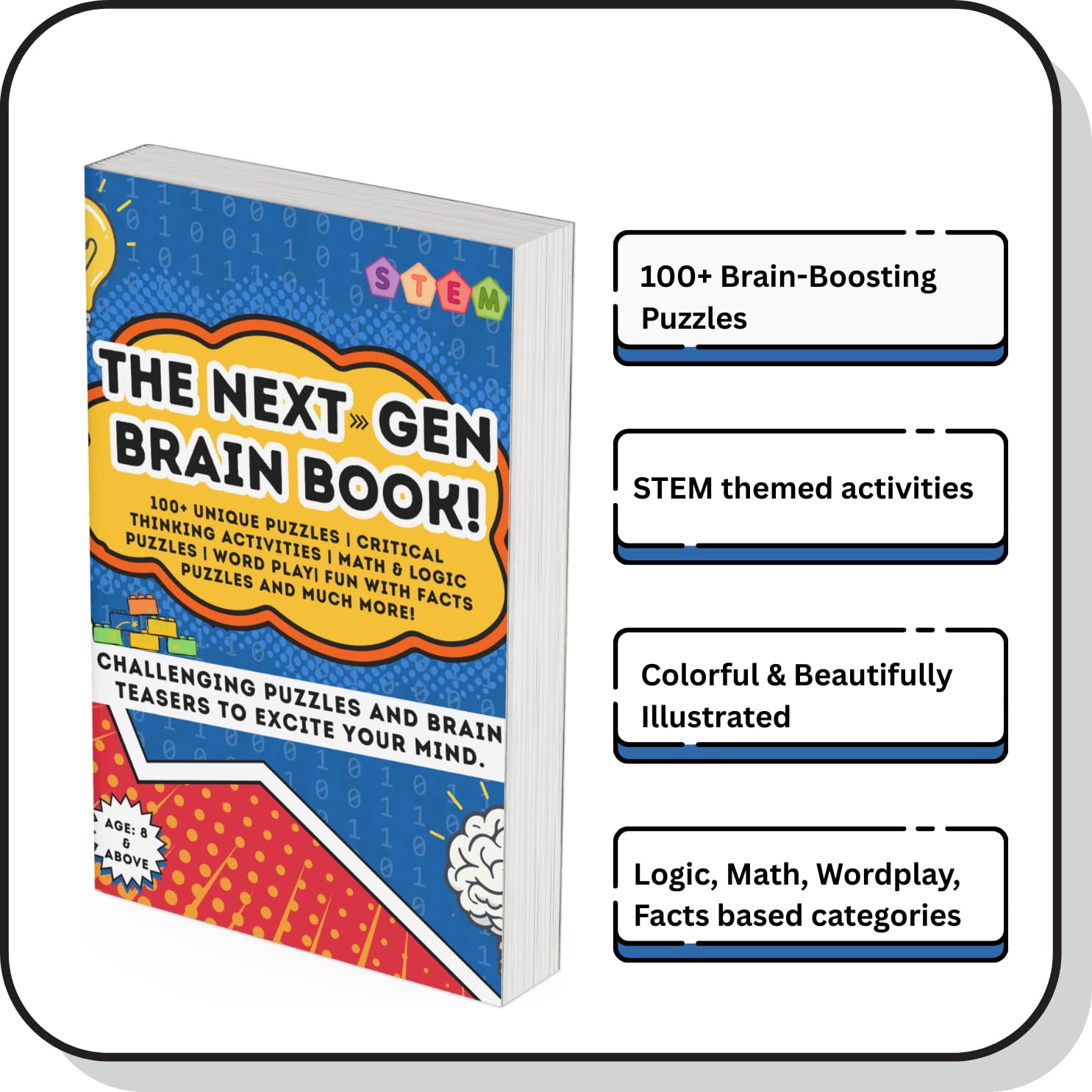 Looking for a fun, screen-free activity book that keeps kids thinking, laughing, and learning? The Next-Gen Brain Book is packed with 100+ puzzles, word games, and brain teasers perfect for curious kids aged 8 and above. It is compact, travel-friendly size makes it easy to pop into a backpack, handbag, or suitcase, so the fun can go anywhere. ⭐ What’s Inside Crosswords Word searches Math Puzzles Logic puzzles Codeword puzzles Facts based Puzzles And more! All themed around Science, Technology, Math, Space, Magic, Travel, and Animals, making every page fresh and engaging. ⭐ Why Kids & Parents Love It? Keeps kids entertained without screens. Boosts problem-solving, logic, and reading skills. Perfect for independent play or family fun. Beautiful illustrations add fun and variety. Travel size: lightweight and easy to carry for holidays, road trips, and flights Great for rainy days, quiet time, and long journeys. ⭐ The Perfect Gift for Clever Kids This activity book makes an excellent birthday present, holiday gift, or screen-free boredom buster for kids aged 8 and above who enjoy puzzles and challenges. Inside this book, children will: Sharpen their thinking and reasoning skills. Improve concentration and memory. Build confidence by solving puzzles step by step. Learn through play-without pressure or stress. Whether your child is just starting out or already loves a good challenge, this puzzle book grows with them, offering the perfect mix of fun and thinking. Say hello to happy minds, curious questions, and confident problem-solvers-and goodbye to boredom!