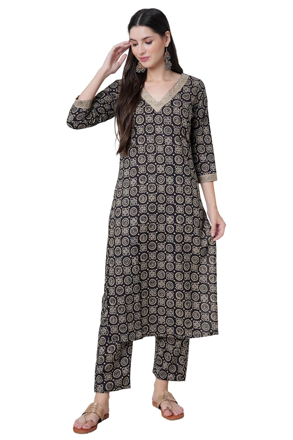 Arayna Women’s Cotton Block Printed Straight Kurta with Palazzo Pants and Dupatta Set