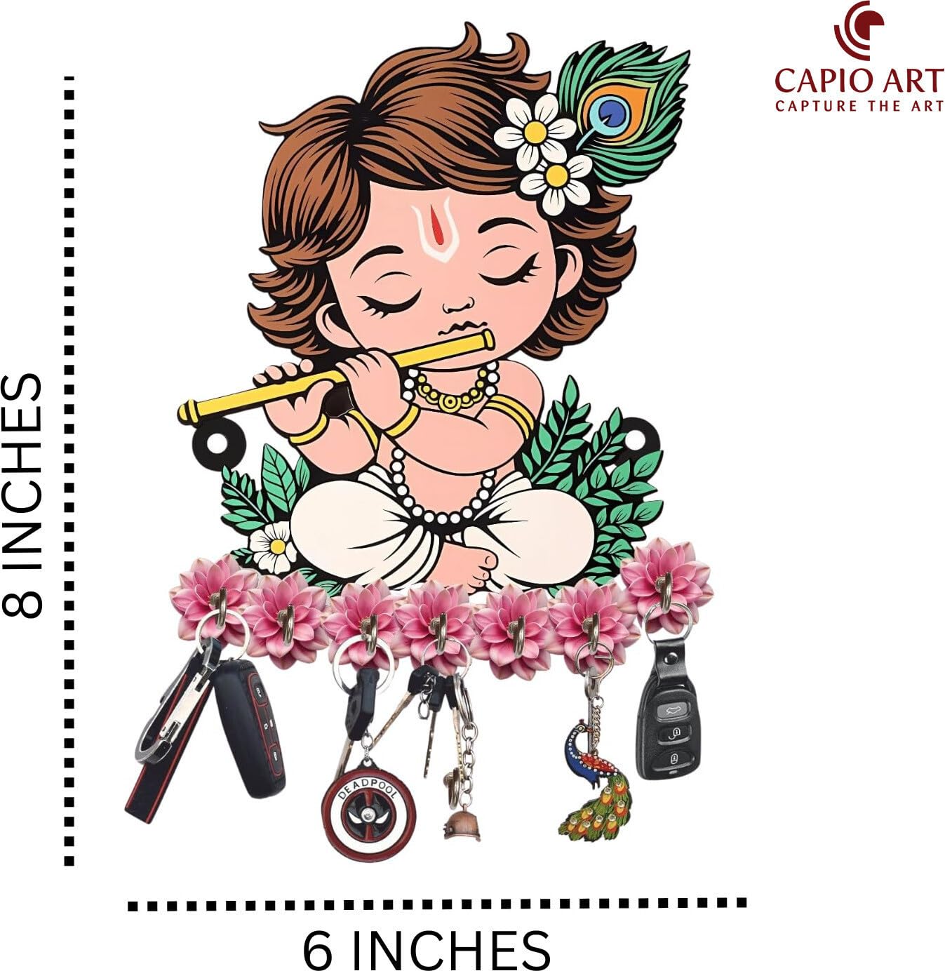 Bring home divine charm and utility with the CAPIO ART Designer Premium HD UV Printed Krishna Key Holder for Wall. Featuring an exquisite Lord Krishna playing flute design with peacock feather artwork, this multipurpose wooden key stand is not just a key organizer but also a piece of spiritual wall decor. With 7 sturdy hooks, it serves as a decorative key holder for car keys, bike keys, office keys, and household keychains, helping you keep your space organized and clutter-free.Crafted with premium HD UV printing, the colors remain vibrant and fade-resistant, ensuring long-lasting elegance. Lightweight yet durable, this wooden key holder for wall is easy to mount and fits perfectly in your living room, entryway, bedroom, or office. The Krishna key hanger with hooks adds positivity, devotion, and aesthetic beauty to any wall.Whether for home wall decor or office wall decor, this premium Krishna key rack with hooks makes an excellent choice. It also doubles as a thoughtful gift for housewarming, weddings, or festivals, combining spirituality, utility, and premium craftsmanship.Transform your walls into a blend of tradition and style with this multipurpose Krishna key holder stand for home & office decor.