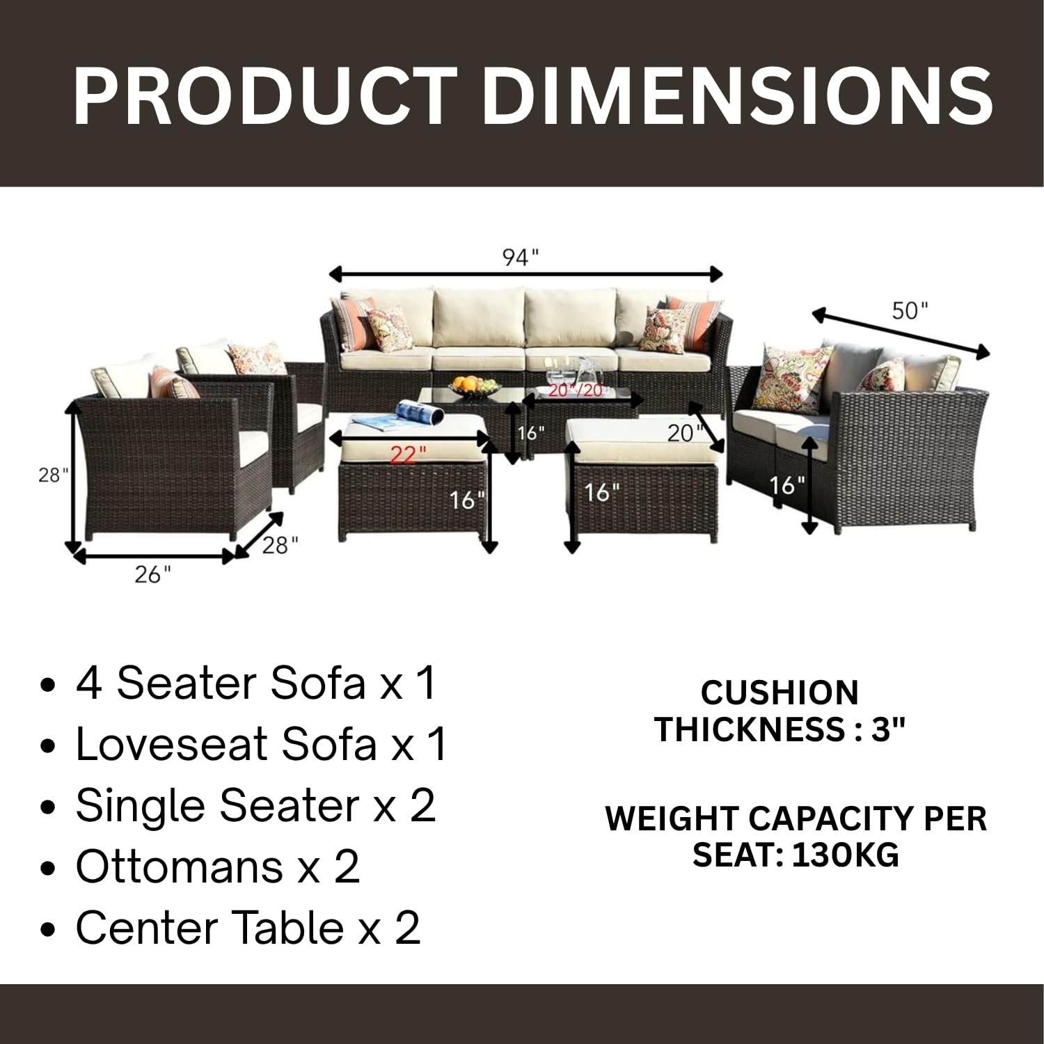 Specifications: Furniture Color: Dark Brown, Cushion Color: Cream, Frame Material: Powder Coated Iron, Furniture Material: Rattan and Wicker, 1 Four Seater Sofa Dimensions: 94″L×26″W×28″H, 1 Double Seater Sofa Dimensions: 50″L×26″W×28″H, 2 Single Seater Sofa Dimensions: 28″L×26″W×28″H, 2 Ottomans Dimensions: 22″L×20″W×16″H, 2 Center Table Dimensions: 20″L×20″W×16″H, Thickness of Cushion: 3″