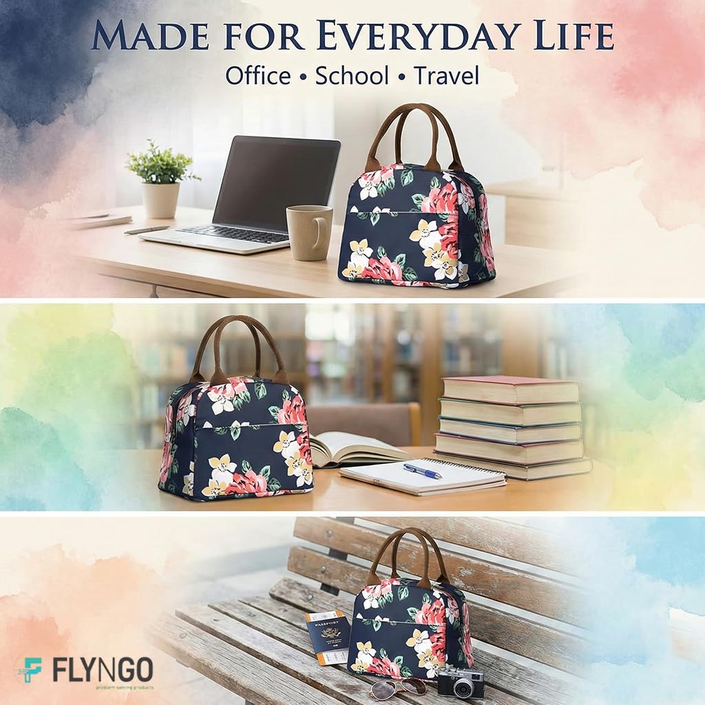 FLYNGO Nylon Large Insulated Lunch Bag for Office Men, School, Women, Tiffin Pouch Bag, Hot & Cold Lunch Box Bags for Boys, and Girls (Blue Rose), 10 Liters