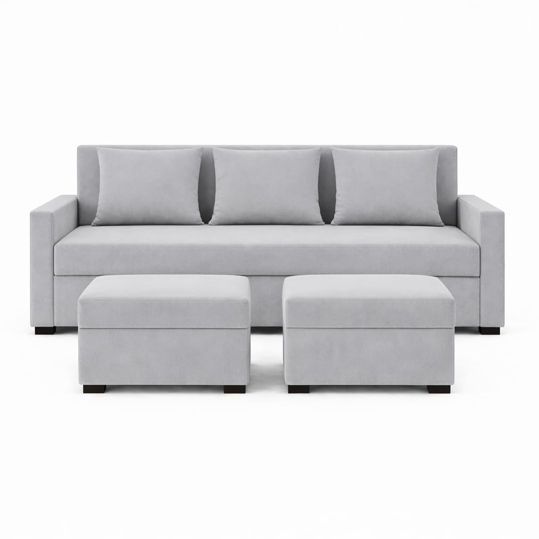 FURNY Lifelano 3 Seater Fabric Sofa Set with 2 Ottomans (Light Grey) with Velvet Finish | Durable Comfort | Ideal for Living Room