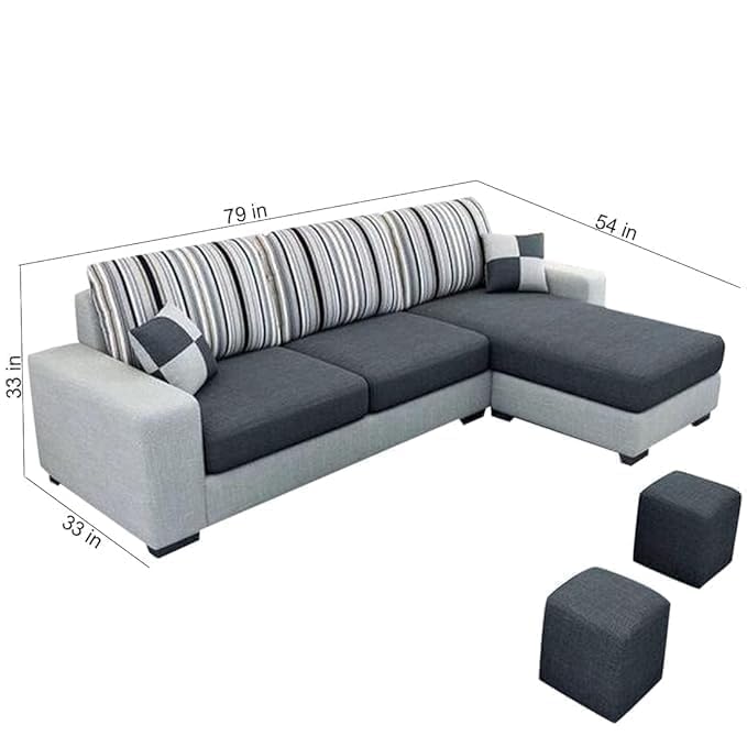FURNY Lunoy 4 Seater Fabric RHS L Shape Sectional Sofa Set with 2 Puffy (Dark Grey-Light Grey Color)
