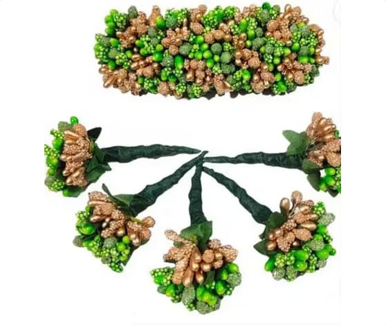 Green Gold Artificial Flower Hair Set | Veni Gajra Brooch Bridal Accessories | Traditional Poola Jada Raakodi Kajra Hair Jewellery | Set for Women & Girls | Ready-to-Wear