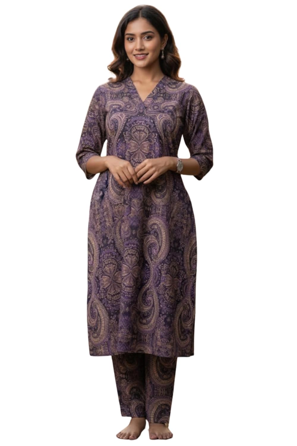 Step into timeless elegance with this stylish Kurti full sleeves for women, designed as a modern alternative to the traditional churidar set. Featuring a rich paisley pattern in regal shades of purple and gold, this ensemble blends ethnic charm with contemporary flair. The comfortable elasticated waist pants offer ease of movement, making it perfect for both festive occasions and daily wear.Crafted for versatility, this Kurti set allows for flexible styling preferences pair it with statement jewelry for a festive look or keep it minimal for a casual outing. The breathable fabric and flattering silhouette ensure all-day comfort, while the detailed size chart helps you find your perfect fit.Whether you’re dressing up for a celebration or seeking a refined everyday outfit, this ethnic wear for women delivers sophistication with every stitch.