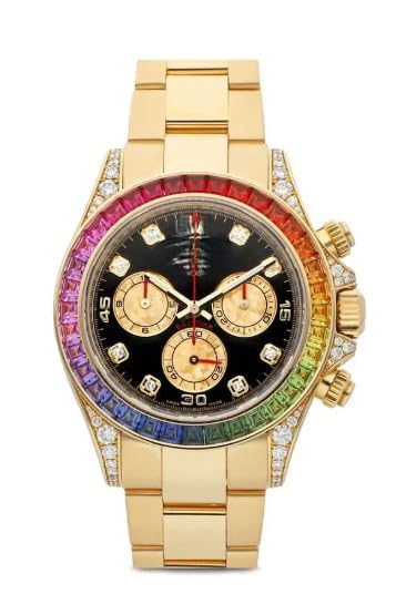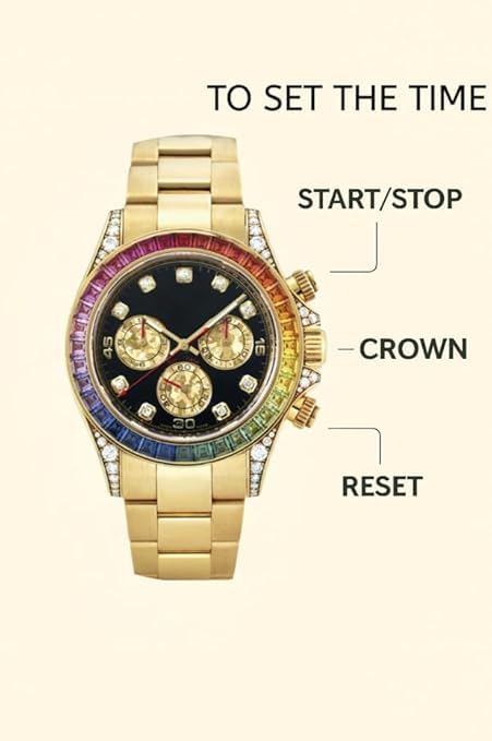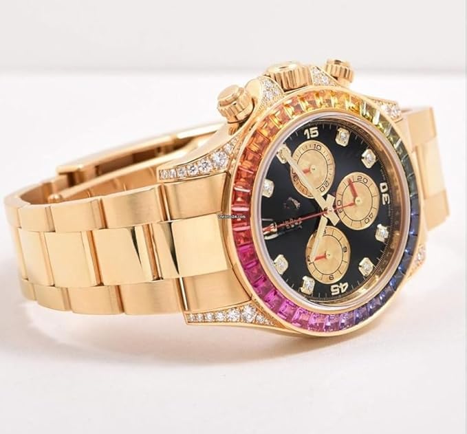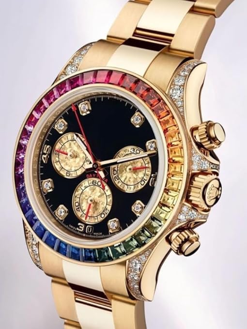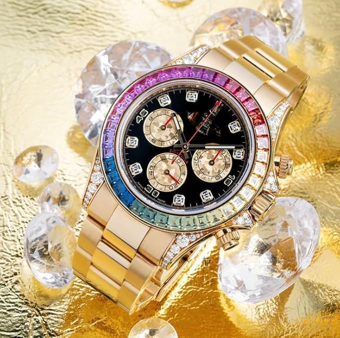 This luxury gold chronograph men’s watch is designed to make a bold style statement with its premium craftsmanship and eye-catching details. The watch features a rich gold-tone stainless steel case and bracelet, delivering a strong, durable build with a high-end finish. A striking rainbow-style bezel with crystal accents adds a vibrant, fashionable appeal, making it ideal for those who prefer standout accessories. The black dial is detailed with multi-function chronograph sub-dials, offering along with precise timekeeping. Crystal hour markers and gold hands enhance visibility while adding a touch of elegance. The side pushers and crown are smoothly finished for easy operation and everyday comfort. Perfect for parties, fashion wear, celebrations, and premium gifting, this designer wristwatch combines luxury aesthetics with functional performance, making it a powerful addition to any modern men’s watch collection.