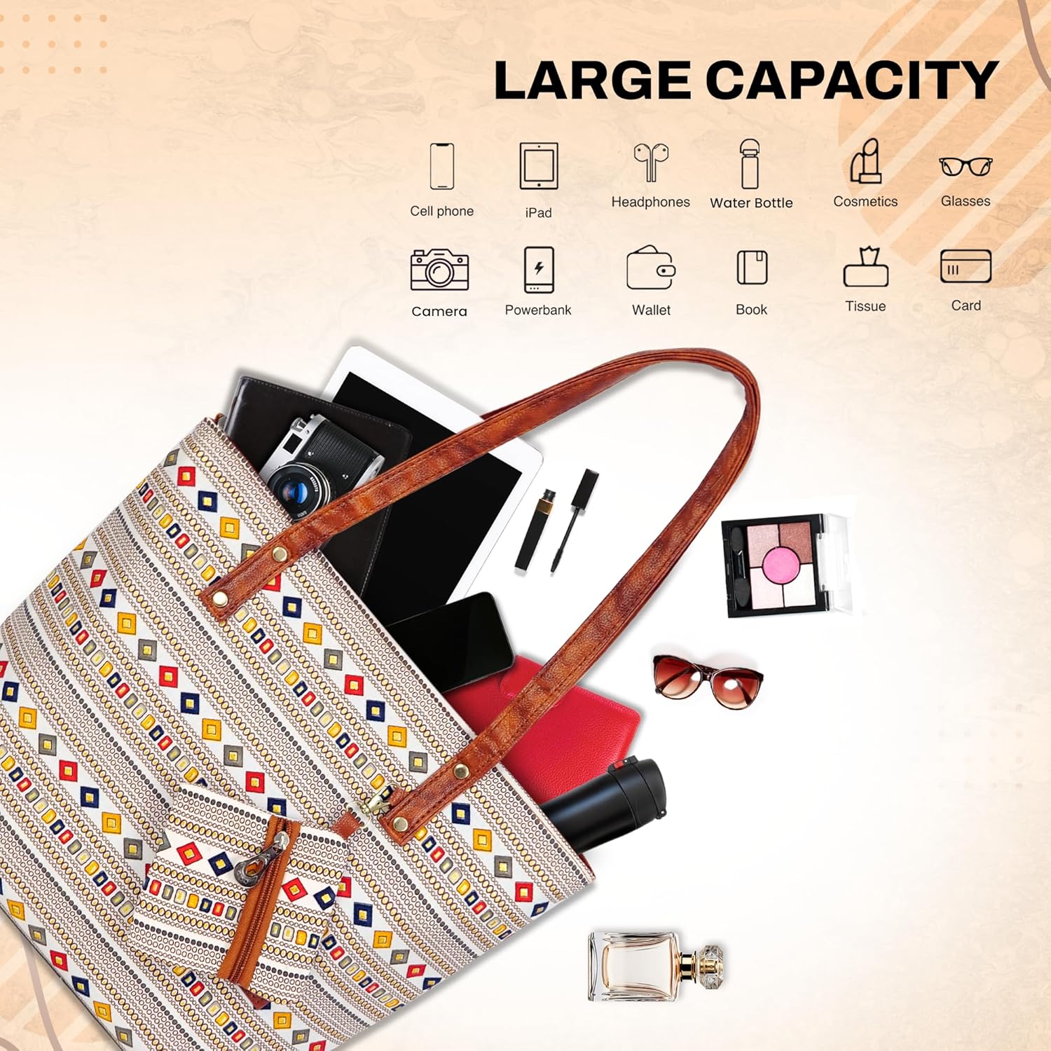 Storite Women’s Tote Bag with Leather Handles & Embroidery Printed Handbag with Zip Pockets, Shoulder Tote Bag and Handbag for Office and College