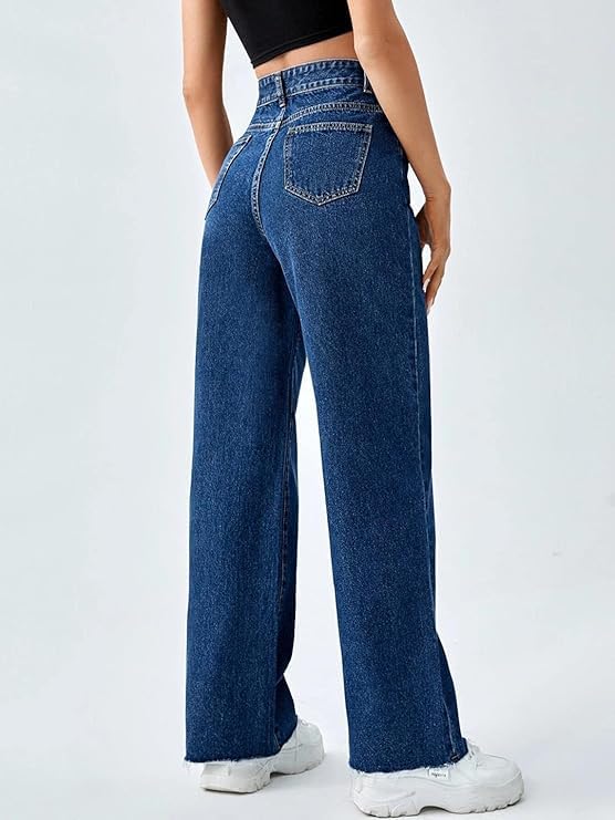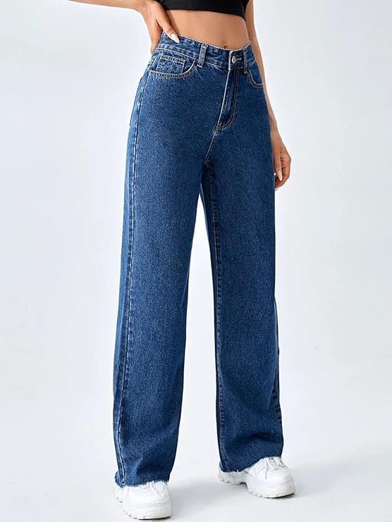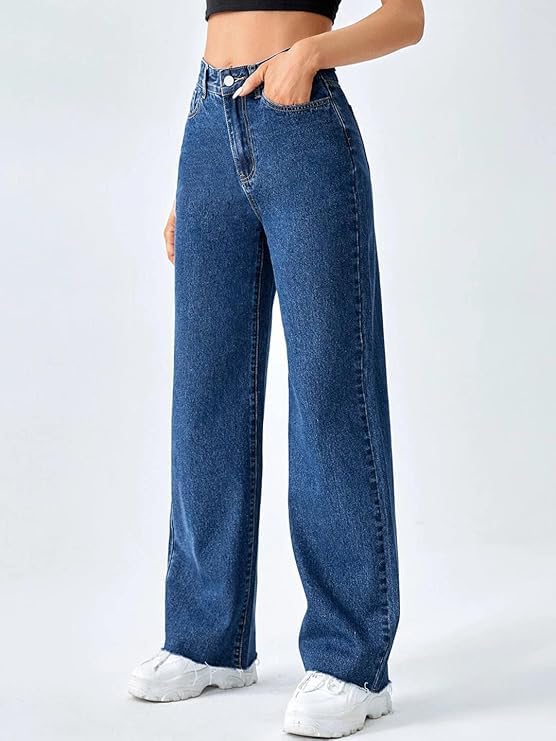 Step into timeless style with these high-waisted wide-leg jeans in classic blue denim. These versatile trousers feature a flattering high-rise silhouette that elongates your legs while providing maximum comfort throughout the day. The relaxed wide-leg cut offers a contemporary twist on traditional denim, perfect for creating numerous stylish ensembles. Crafted from quality denim fabric, these jeans showcase classic five-pocket styling and a button-fly closure. The raw hem adds an edgy, modern touch to the overall design. These jeans pair beautifully with everything from casual trainers to elegant heels, making them suitable for both everyday wear and dressier occasions. The structured waistband ensures a secure fit, while the roomy leg design allows for unrestricted movement. These jeans can be styled with cropped tops, tucked-in blouses, or oversized sweaters for versatile looks throughout the seasons. Machine washable for easy care.