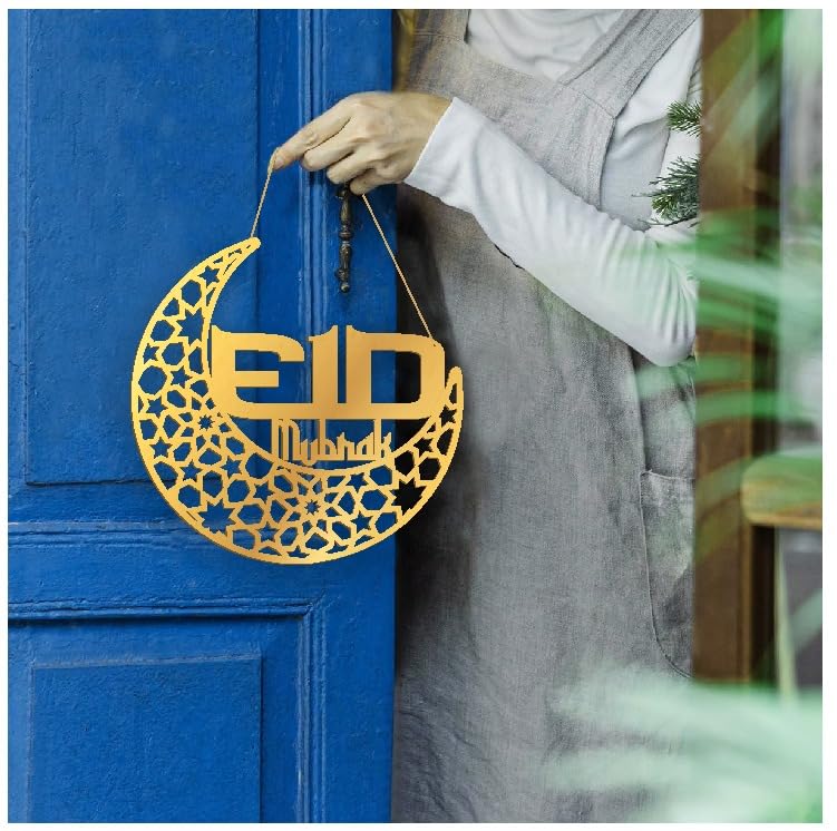 SVM CRAFT® Ramadan Decor,Eid Mubarak Door Sign Wooden Hanging Signs,Ramadan Decorations for Home, Ramadan Door Decoration,eid Gift Items, Ramadan Mubarak wall hanging, ramdan mubarak banner (gold eid)