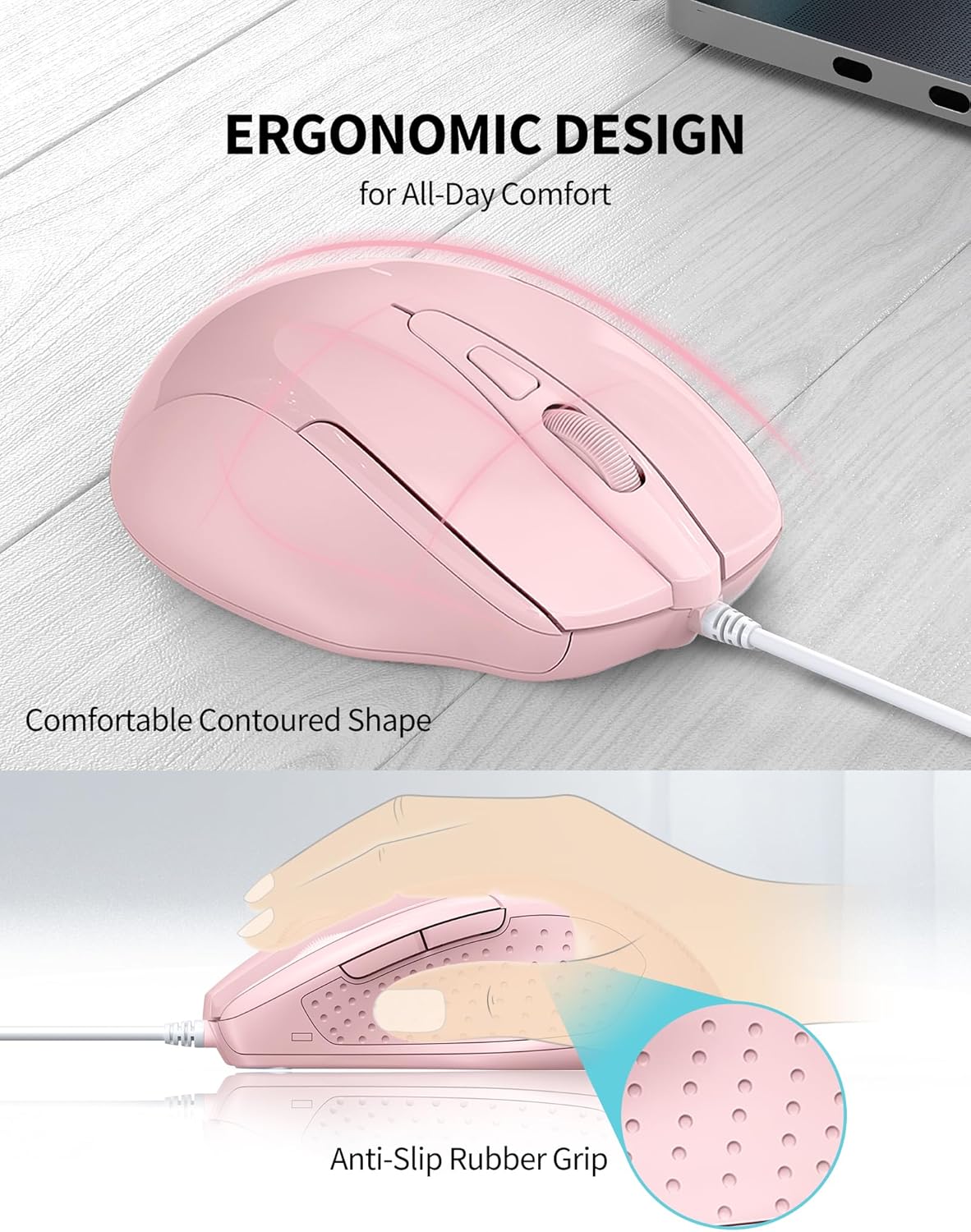 TECKNET Wired Mouse, 6-Button Corded with 4 Adjustable DPI, Optical Ergonomic Design, 5FT Cord for Laptop, Chromebook, PC, Desktop, Mac, Notebook – Pink