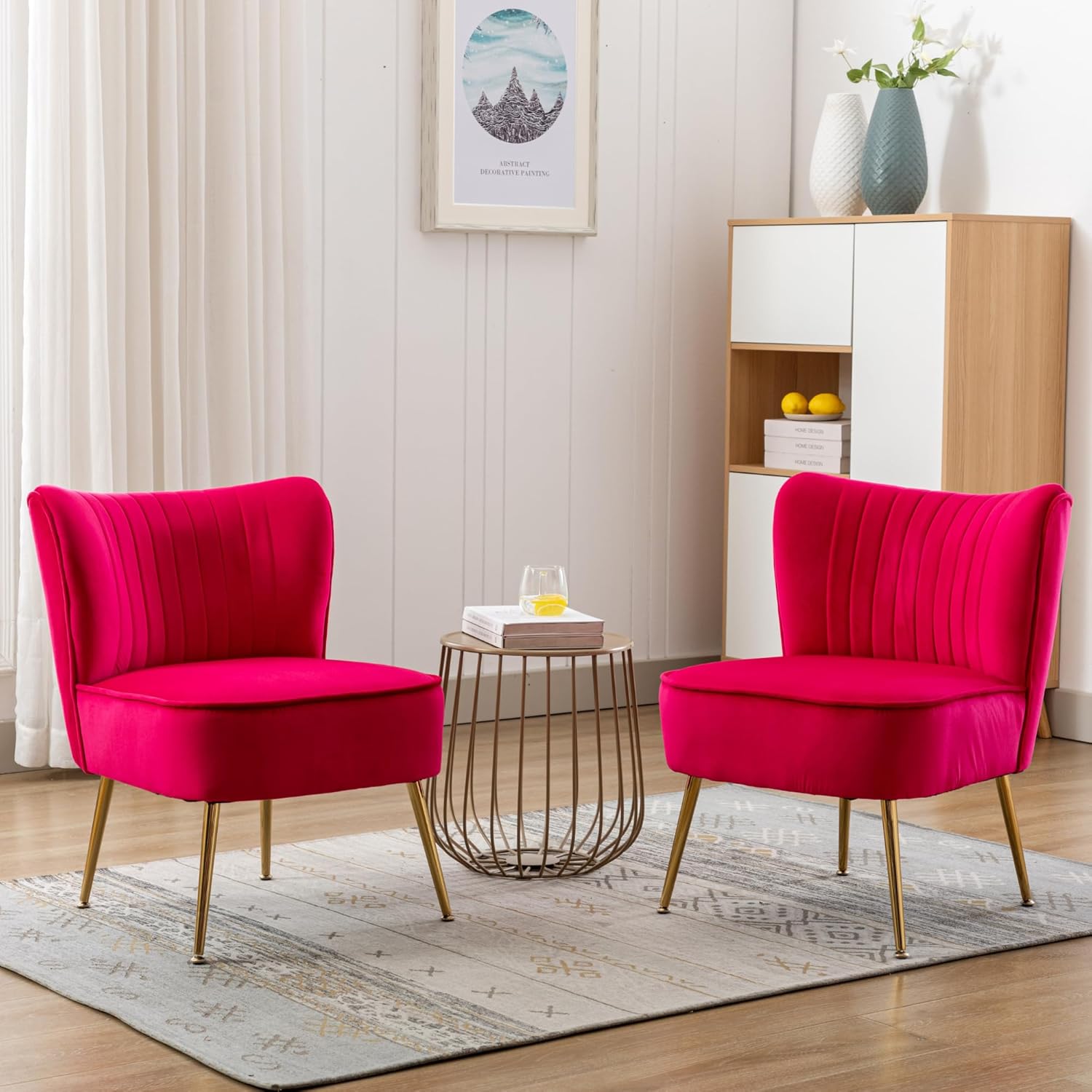 Velvet Accent Chair Set of 2 Comfy Living Room Chair Armless Slipper Chair Mid Century Side Chair Single Sofa Chair with Golden Legs Wingback for Bedroom Guest Room, Hot Pink