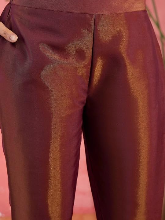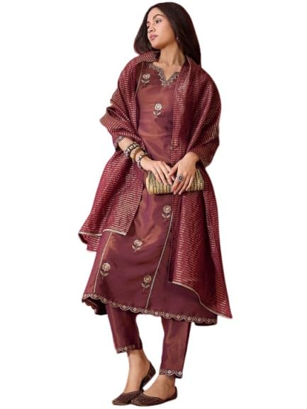 This exquisite women’s embroidered kurta set brings together traditional elegance and contemporary style in a stunning maroon hue. The three-piece ensemble features a beautifully crafted kurta adorned with delicate floral embroidery that adds a touch of sophistication to the outfit. The intricate embroidery work on the neckline and throughout the kurta showcases fine craftsmanship, whilst the matching embroidered borders on the sleeves and hem create a cohesive, polished look. Crafted from a comfortable cotton blend fabric, this salwar suit offers breathability and ease of movement, making it perfect for both festive occasions and everyday wear. The set includes a coordinating dupatta with elegant striped detailing and subtle golden accents that beautifully complement the kurta. The straight-cut pants feature matching embroidered borders that tie the entire ensemble together. This versatile kurta set can be dressed up for celebrations, religious ceremonies, or cultural events, and equally works well for casual gatherings. The rich maroon colour exudes warmth and elegance, making it a timeless addition to any wardrobe. Perfect for women who appreciate the blend of traditional aesthetics with modern comfort.