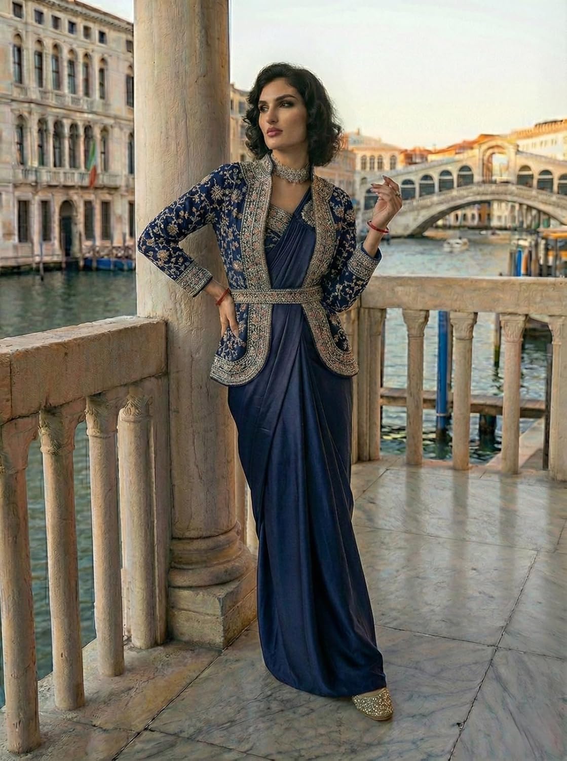 Women’s Teal Blue Silk Pre-Draped Saree with Heavily Embroidered Jacket & Waist Belt | Indo-Western Fusion Set for Weddings and Parties